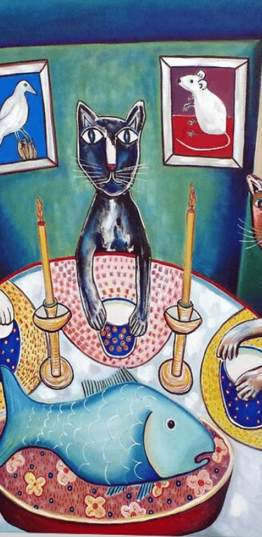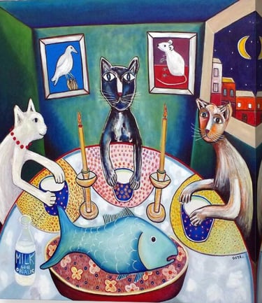 This painting gathers its figures around a shared table, feline forms poised between play and ceremony. Shapes curve in luminous tones of blue, green, and ochre, creating an arrangement that feels at once whimsical and refined. Each cat becomes a character, yet together they create a rhythm — an interwoven pattern of presence and gaze.