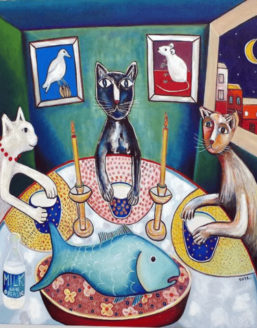 This lively composition draws the viewer into an intimate feline gathering, where playful figures are arranged with deliberate rhythm. Each cat appears as both character and motif, their placement forming a balance between spontaneity and structure. Osta’s restrained palette of blues and ochres further refines this harmony, grounding the scene while lifting it toward allegory.